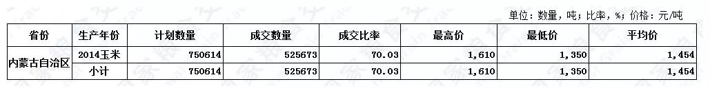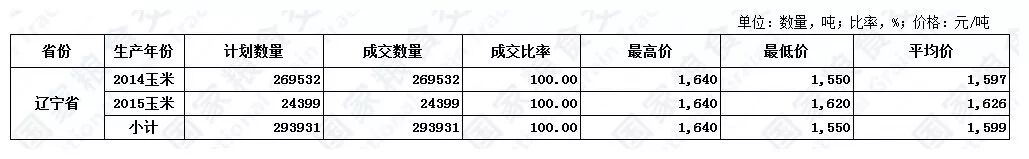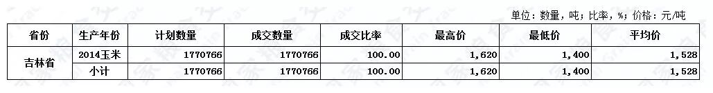 其中一等玉米投放718063吨,成交718063吨,成交率100%,最高成交价1620元/吨,最低成交价1480元/吨,成交均价1542元/吨;