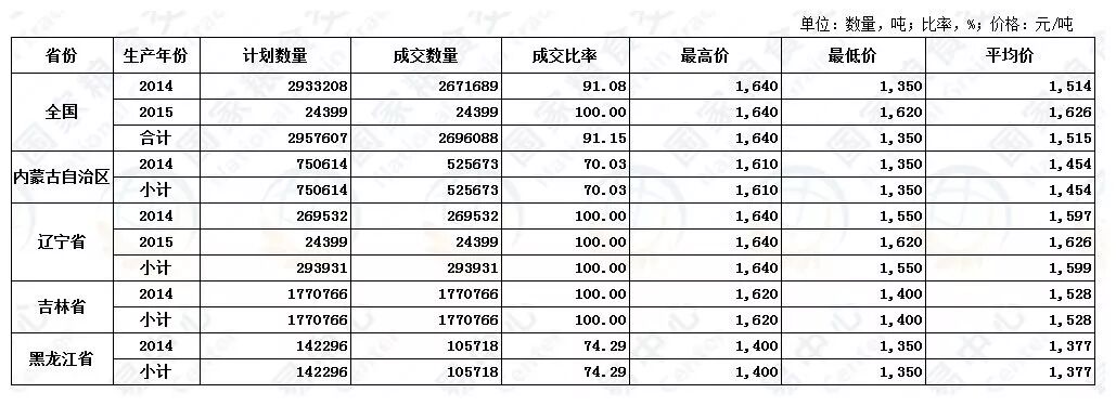 2014年计划销售2933208吨,成交量2671689吨,成交率91.08%,最高价1640最低价1350平均价1514;2015年计划销售24399吨,全部成交,最高价1640最低价1620平均价1626。(点击可查看大图哦)